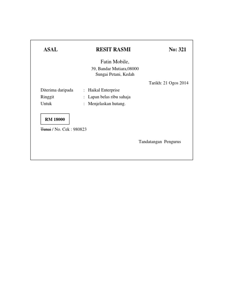 Untuk makluman resit hanya akan sedia dicetak dalam anggaran 10 minit. Results for resit rasmi asal translation from Malay to English. Tuntutan hendaklah dibuat dalam tempoh tidak melebihi 90 hari daripada tarikh resit dalam tahun semasa.