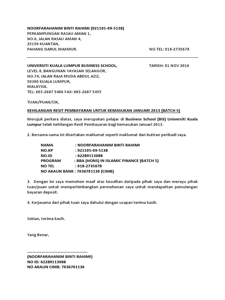 Surat Rasmi Permohonan Pemulangan Bayaran Deposit Pdf