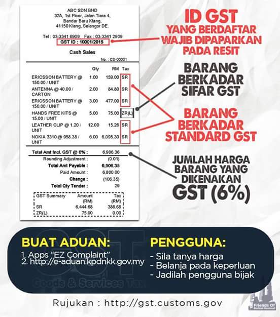 Sejak Cukai Barangan dan Perkhidmatan GST 6 mula dilaksanakan pada 1 April 2015 media sosial dilambakkan dengan gambar-gambar resit yang dimuat naik. Skop pelaksanaan yang luas hampir semua barang dikenakan dengan GST kecuali dinyatakan Dikenakan pada. Pengurangan kadar GST ni baru je dijalankan jadi peniaga mungkin akan ambil masa untuk tukar label harga dekat barangan satu-persatu nak lagi kat kedai macam Mr DIY tak ke lenguh sendi lengan sehingga memerlukan Yoko Yoko.